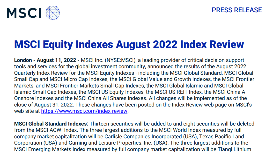 北京时间8月12日早间,,,,,,全球着名指数公司MSCI宣布了季度审核变换效果,,,,,,将新利18锂业等7只A股股票新纳入MSCI中国指数。。。。。。。。